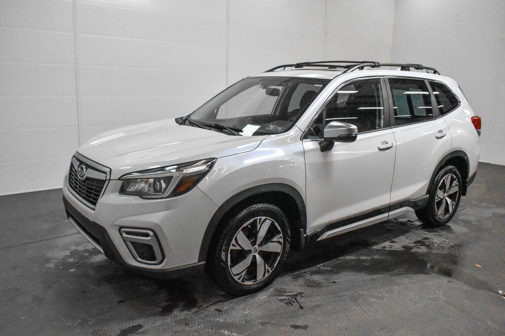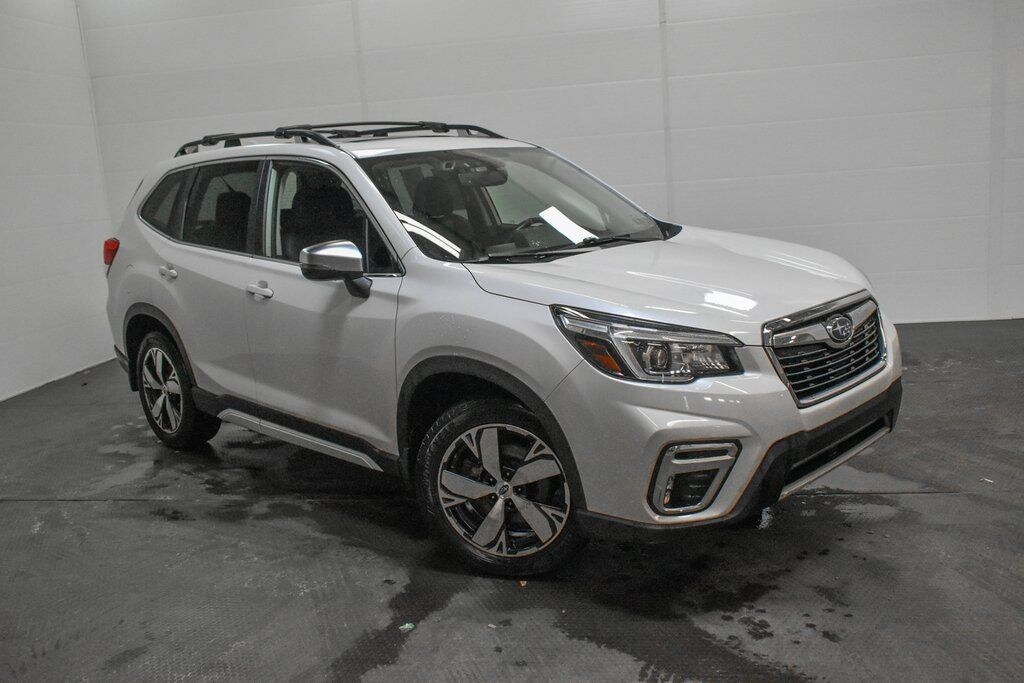 This Forester is well equipped with Popular Package #2 (All-Weather Floor Liners, Auto-Dimming Exterior Mirror w/Approach Lighting, Auto-Dimming Mirror w/Compass & HomeLink, Cargo Net, and Rear Bumper Cover), Navigation System, 3.70 Axle Ratio, 4-Wheel Disc Brakes, 9 Speakers, ABS brakes, Aero Crossbar Set, Air Conditioning, Alloy wheels, AM/FM radio: SiriusXM, Auto High-beam Headlights, Automatic temperature control, Brake assist, Bumpers: body-color, CD player, Driver door bin, Driver vanity mirror, Dual front impact airbags, Dual front side impact airbags, Electronic Stability Control, Emergency communication system: STARLINK Safety and Security (Subscription Required), Exterior Parking Camera Rear, Four wheel independent suspension, Front anti-roll bar, Front Bucket Seats, Front Center Armrest, Front dual zone A/C, Front fog lights, Front reading lights, Fully automatic headlights, harman kardon 576W Amp & Speaker System, harman/kardon® Speakers, Heated door mirrors, Heated Front Bucket Seats, Heated front seats, Heated rear seats, Heated steering wheel, HVAC memory, Illuminated entry, Knee airbag, Leather Shift Knob, Low tire pressure warning, Memory seat, Occupant sensing airbag, Outside temperature display, Overhead airbag, Overhead console, Paddle-Shift Control Switches, Panic alarm, Passenger door bin, Passenger vanity mirror, Perforated Leather-Trimmed Upholstery, Power door mirrors, Power driver seat, Power Liftgate, Power moonroof: Panoramic, Power passenger seat, Power steering, Power windows, Premium audio system: harman/kardon, Radio data system, Radio: Subaru Starlink 8.0" Multimedia Nav System, Rear anti-roll bar, Rear seat center armrest, Rear Seatback Protector, Rear window defroster, Rear window wiper, Remote keyless entry, Roof rack: rails only, Security system, Speed control, Speed-sensing steering, Splash Guards, Split folding rear seat, Spoiler, STARLINK/Apple CarPlay/Android Auto, Steering wheel mounted audio controls, Tachometer, Telescoping steering wheel, Tilt steering wheel, Traction control, Trip computer, Turn signal indicator mirrors, Variably intermittent wipers, and Wheels: 18" x 7.0J Blk Machine Touring Alum Alloy.