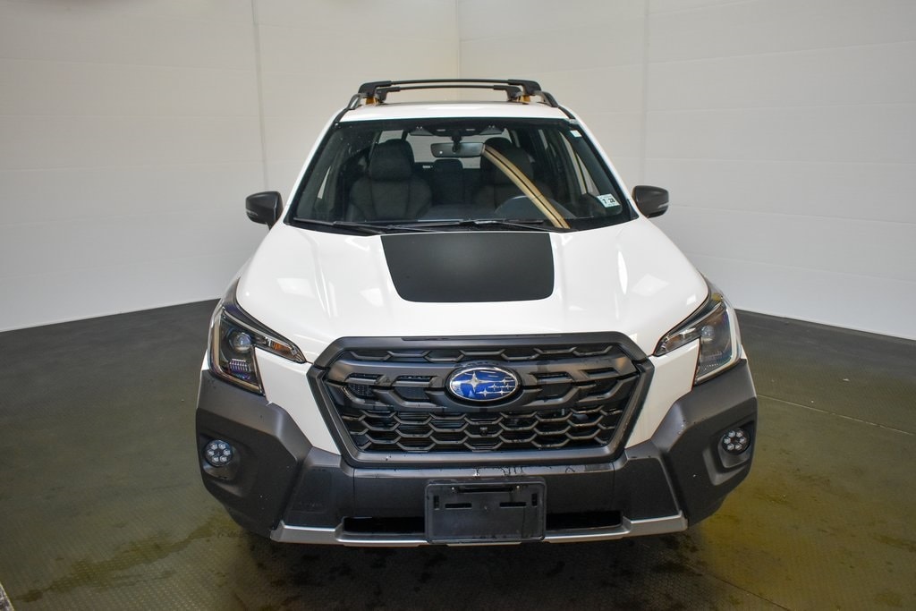 This Forester is well equipped with 8" Audio w/harman/kardon & Power Rear Gate (harman/kardon 9-Speaker Audio System, Power Rear Gate, and Radio: Subaru Starlink 8.0" Multimedia Nav System), Navigation System, 4-Wheel Disc Brakes, 4.11 Axle Ratio, 6 Speakers, ABS brakes, Air Conditioning, Alloy wheels, AM/FM radio: SiriusXM, Anti-whiplash front head restraints, Auto High-beam Headlights, Auto-Dimming Exterior Mirror w/Approach Light, Auto-Dimming Mirror w/Compass & HomeLink, Automatic temperature control, Brake assist, Bumpers: body-color, Cargo Sidewall Protector, CD player, Driver door bin, Driver vanity mirror, Dual front impact airbags, Dual front side impact airbags, Electronic Stability Control, Emergency communication system: STARLINK Safety and Security (Subscription Required), Exterior Parking Camera Rear, Four wheel independent suspension, Front anti-roll bar, Front Bucket Seats, Front Center Armrest, Front dual zone A/C, Front fog lights, Front reading lights, Fully automatic headlights, Heated door mirrors, Heated Front Bucket Seats, Heated front seats, Illuminated entry, Knee airbag, Leather Shift Knob, Low tire pressure warning, Occupant sensing airbag, Outside temperature display, Overhead airbag, Overhead console, Panic alarm, Passenger door bin, Passenger vanity mirror, Power door mirrors, Power driver seat, Power moonroof: Panoramic, Power steering, Power windows, Radio data system, Radio: Subaru Starlink 8.0" Multimedia Plus System, Rear anti-roll bar, Rear Bumper Cover, Rear seat center armrest, Rear Seatback Protector - Wilderness, Rear window defroster, Rear window wiper, Remote keyless entry, Roof rack: rails only, Security system, Speed control, Speed-sensing steering, Splash Guards - Wilderness, Split folding rear seat, Spoiler, STARLINK/Apple CarPlay/Android Auto, Steering wheel mounted audio controls, Tachometer, Telescoping steering wheel, Textured StarTex Upholstery, Tilt steering wheel, Traction control, Trip computer, Turn signal indicator mirrors, Variably intermittent wipers, and Wheels: 17" x 7.0 J Matte Black Finish Alum-Alloy.