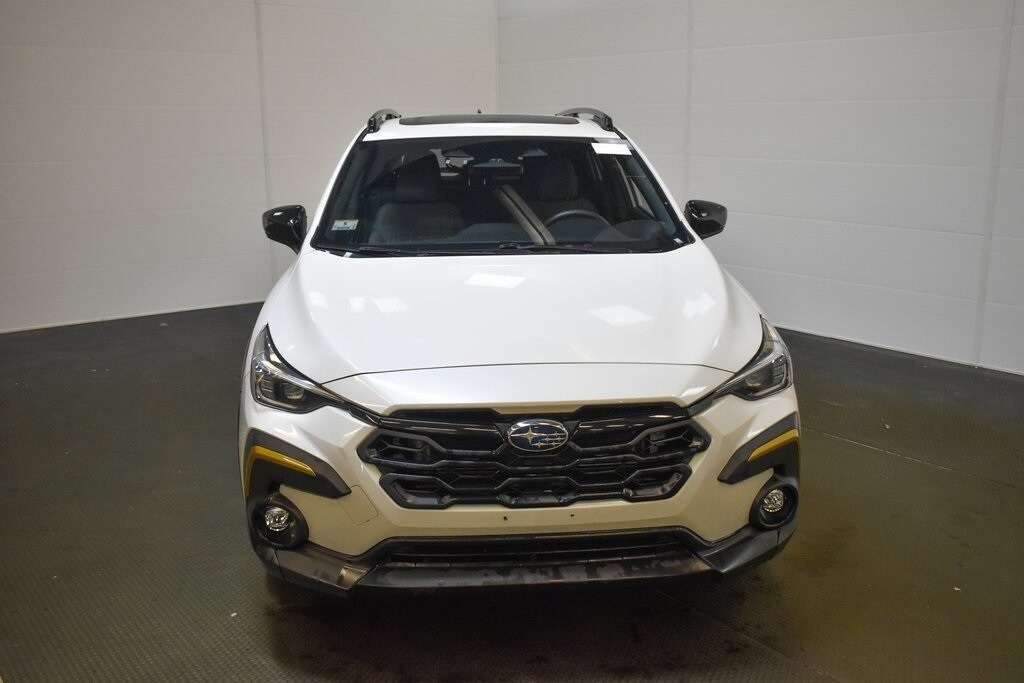 This Crosstrek is well equipped with BSD/RCTA & Power Driver Seat & Power Moonroof (10-Way Power Driver's Seat, Blind Spot Detection w/Rear Cross-Traffic Alert, and Power Moonroof), 3.70 Axle Ratio, 4-Wheel Disc Brakes, 6 Speakers, ABS brakes, Air Conditioning, Alloy wheels, AM/FM radio: SiriusXM, Anti-whiplash front head restraints, Auto High-beam Headlights, Automatic temperature control, Brake assist, Bumpers: body-color, Driver door bin, Driver vanity mirror, Dual front impact airbags, Dual front side impact airbags, Electronic Stability Control, Emergency communication system: STARLINK Safety and Security (Subscription Required), Exterior Parking Camera Rear, Four wheel independent suspension, Front anti-roll bar, Front Bucket Seats, Front Center Armrest, Front dual zone A/C, Front fog lights, Front reading lights, Fully automatic headlights, Heated door mirrors, Heated Front Bucket Seats, Heated front seats, Illuminated entry, Knee airbag, Leather Shift Knob, Low tire pressure warning, Occupant sensing airbag, Outside temperature display, Overhead airbag, Overhead console, Panic alarm, Passenger door bin, Passenger vanity mirror, Power door mirrors, Power steering, Power windows, Radio data system, Radio: Subaru STARLINK 11.6" Multimedia Plus Sys, Rear anti-roll bar, Rear seat center armrest, Rear window defroster, Rear window wiper, Remote keyless entry, Security system, Speed control, Speed-sensing steering, Split folding rear seat, Spoiler, Sport Cloth Upholstery, STARLINK/Apple CarPlay/Android Auto, Steering wheel mounted audio controls, Tachometer, Telescoping steering wheel, Tilt steering wheel, Traction control, Trip computer, Turn signal indicator mirrors, Variably intermittent wipers, and Wheels: 18" x 7.0J Dark Gray Aluminum Alloy.